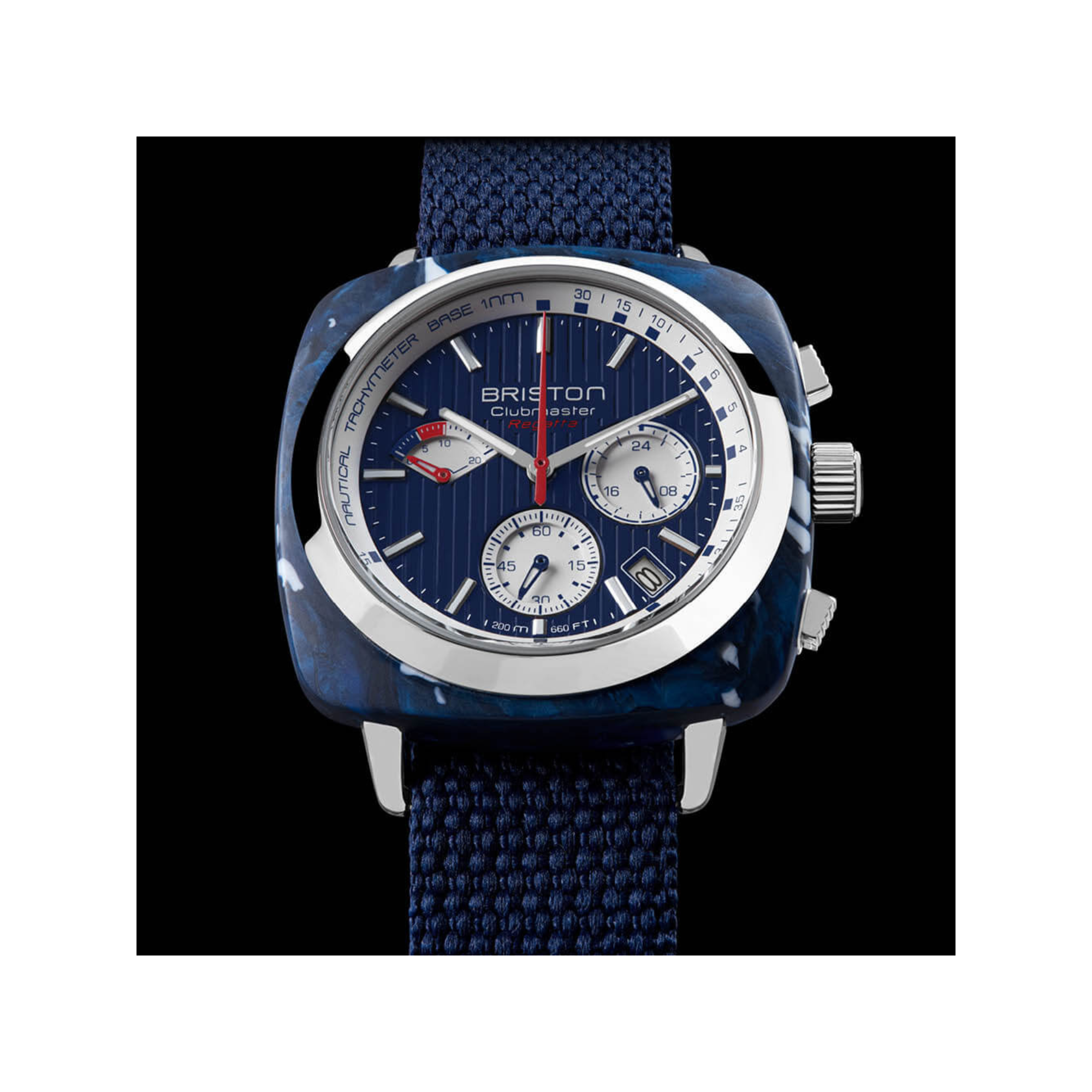 Clubmaster Regatta chronograph watch, 42 mm. The Most Beautiful Bays in the World Special edition. Matt blue recycled plastic case, produced in Belgium. Navy blue dial with raised bars. Chronograph, regatta counter with 5'+5' countdown, 24-hour counter at 3 o'clock and small seconds counter at 6 o'clock. Inner ring with nautical tachymeter scale. Bar hands and indexes with white Superluminova® luminescent inserts. Curved ultra-resistant K1 glass. Water-resistant to 200m / 20 ATM. NATO strap (20 mm): Navy blue in length 245 mm. Interchangeable without tools. Water-resistant. Hybrid mechaquartz movement calibre VK83.