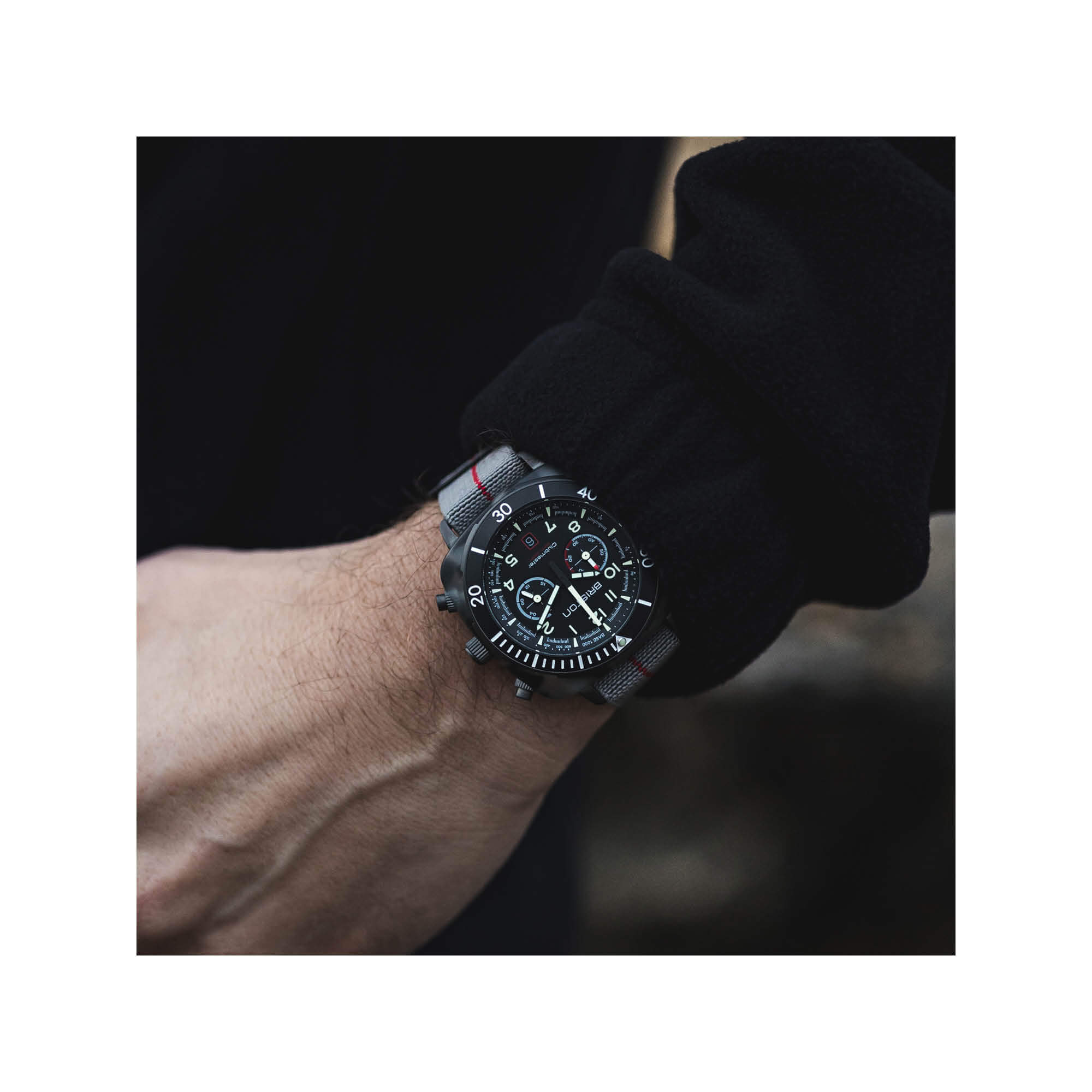- Reborde interior fijo con líneas blancas e índices en Superluminova® luminiscente natural y escala taquimétrica