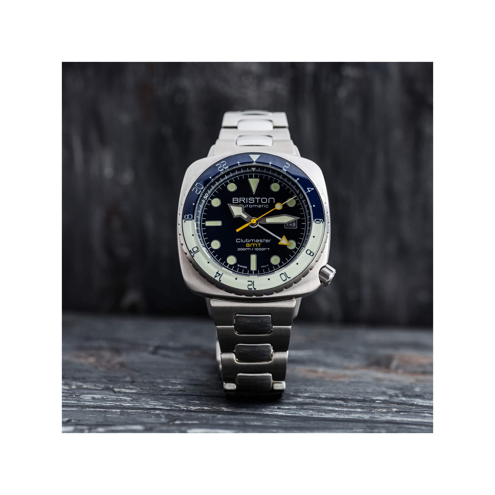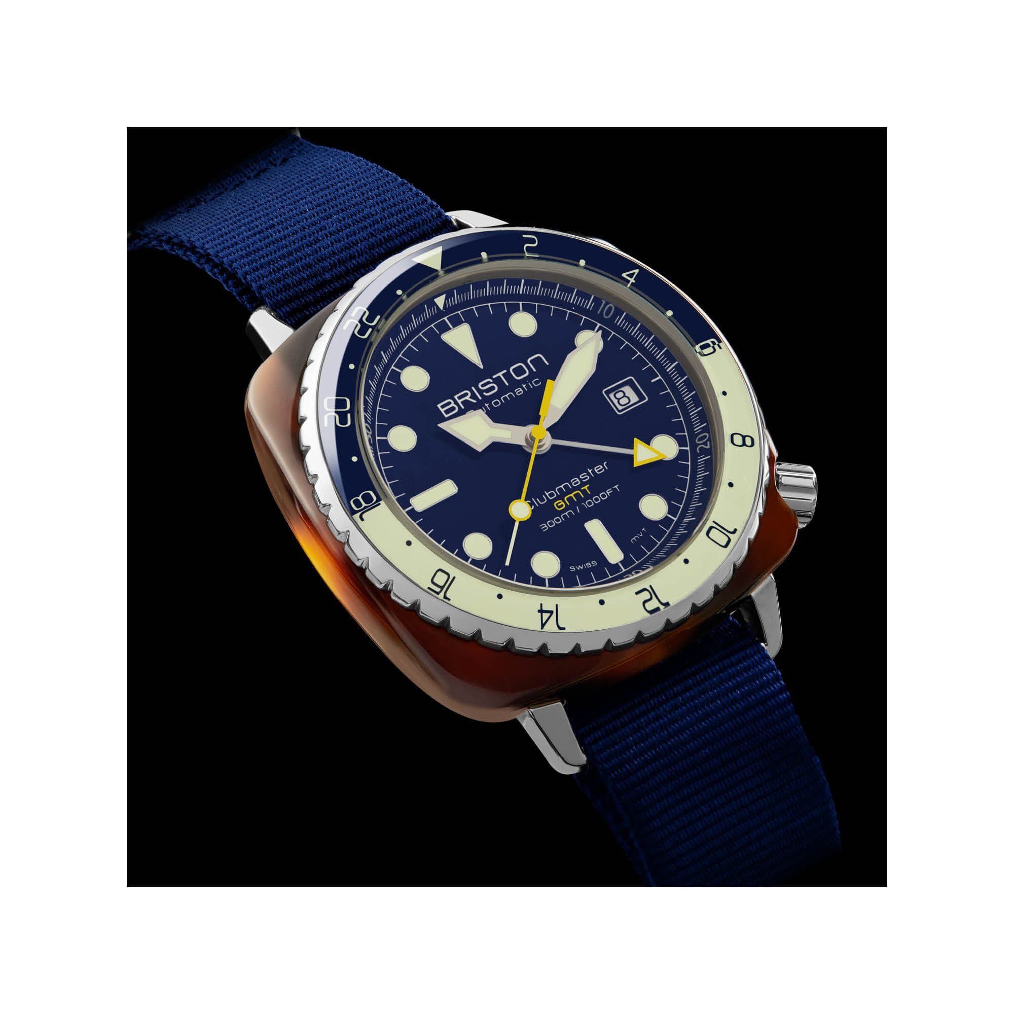 Montre automatique Clubmaster Diver Pro GMT, 44 mm. Boitier en acier inoxydable et acétate écaille. Cadran bleu marine avec finition brillante. Heures, Minutes, Seconde centrale, GMT et Date à guichet à 3 heures. Lunette crantée tournante unidirectionnelle en saphir avec indication AM/PM en Superluminova® naturel. Aiguilles « flèche » en acier poli avec inserts Superluminova® naturel. Glace ultra résistante en saphir – 3,3 mm d’épaisseur. Couronne vissée et gravée en acier poli à 4h. Étanche à 300m / 30 ATM. Bracelet exclusif Briston, interchangeable, en nylon bleu marine. Deuxième bracelet Velcro® bleu marine. Calibre à mouvement automatique Suisse SW330-1.