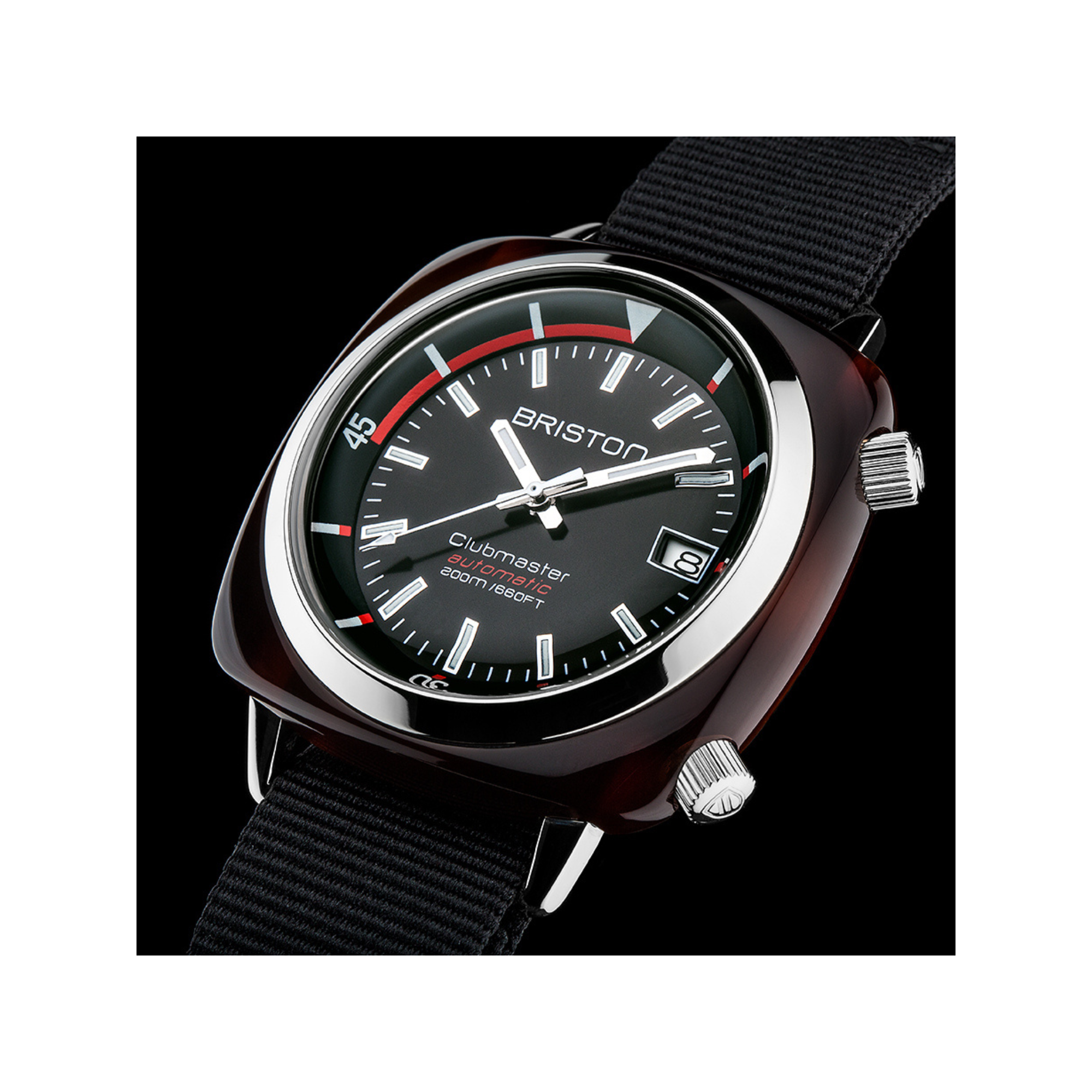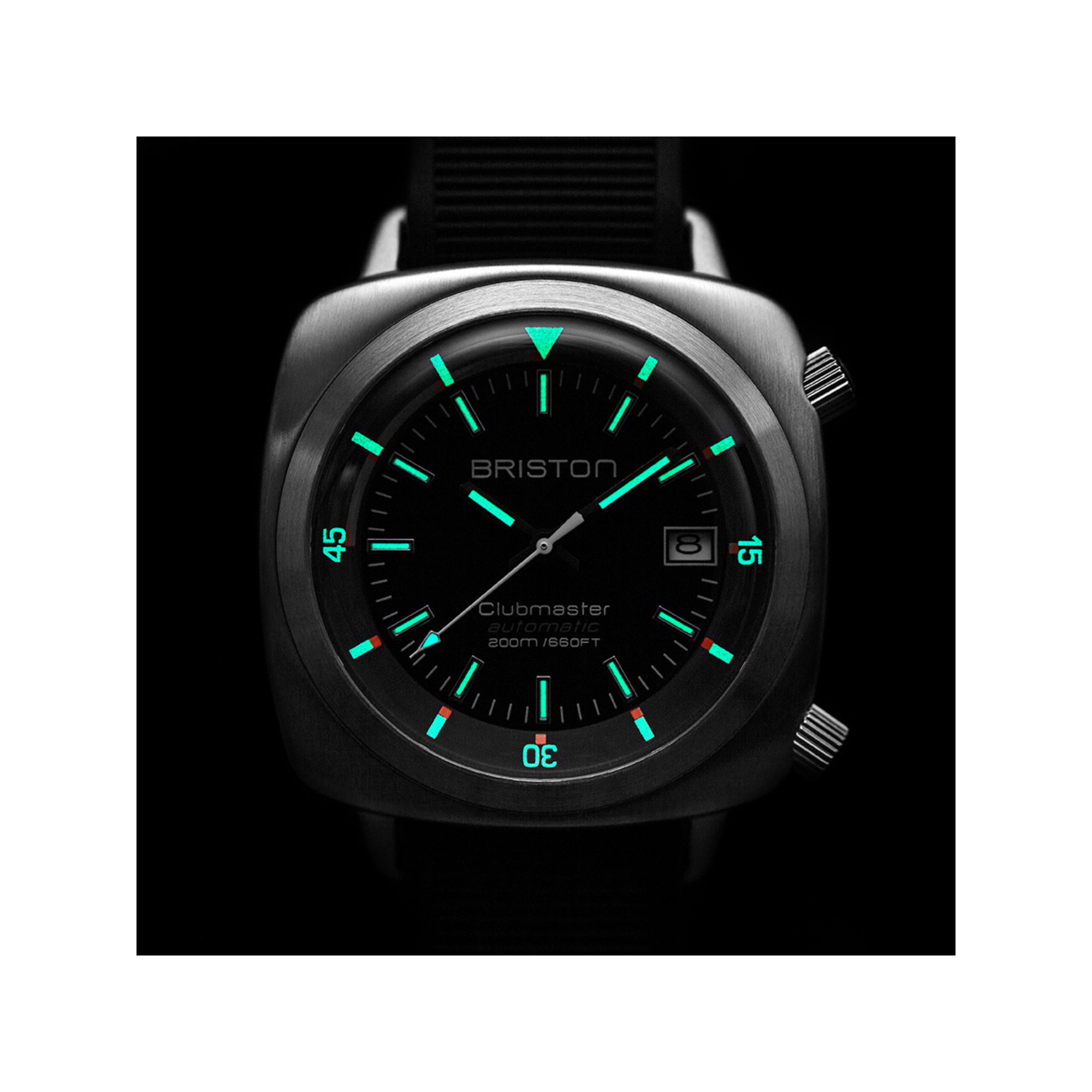 Pour une parfaite visibilité quelques soient les conditions, Briston a doté la Clubmaster Diver d'inserts luminescents en Superluminova® C1. Un matériau performant qui ne se dégrade pas et dont le cycle chargement/déchargement ne s'altère pas dans le temps.