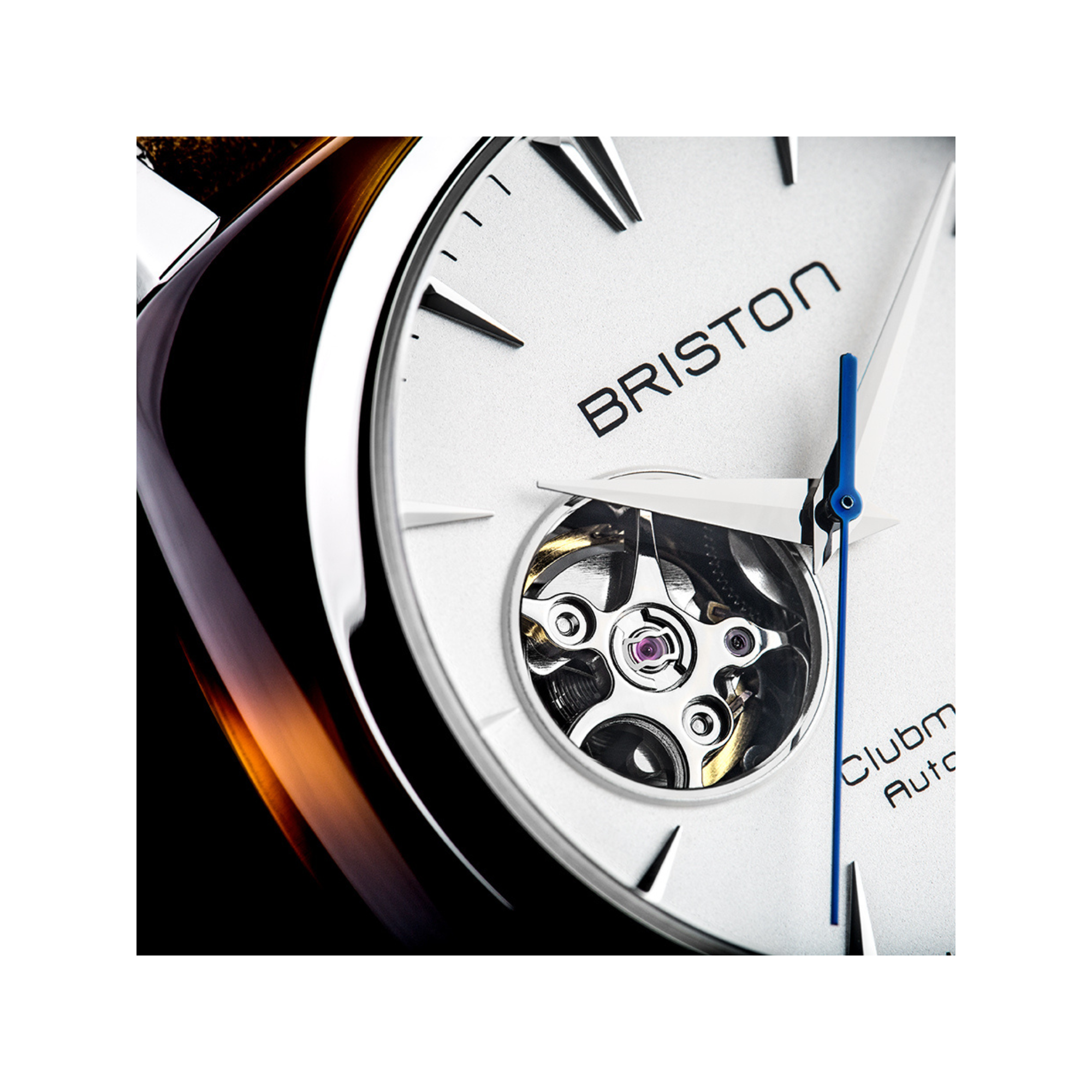 Montre HMS automatique Clubmaster Iconic Open, 40 mm. Boitier en acier inoxydable et acétate écaille. Cadran noir semi-brillant avec ouverture à 9 heures. Heures, Minutes, Secondes. Indexes polis en forme de flèche. Aiguilles style "Dauphine" en rhodium poli. Glace ultra résistante en saphir. Bracelet exclusif Briston, interchangeable, en cuir vintage marron. Fond transparent. Mouvement automatique NH38 équipé d’une masse oscillante avec décoration “Côte de Genève".