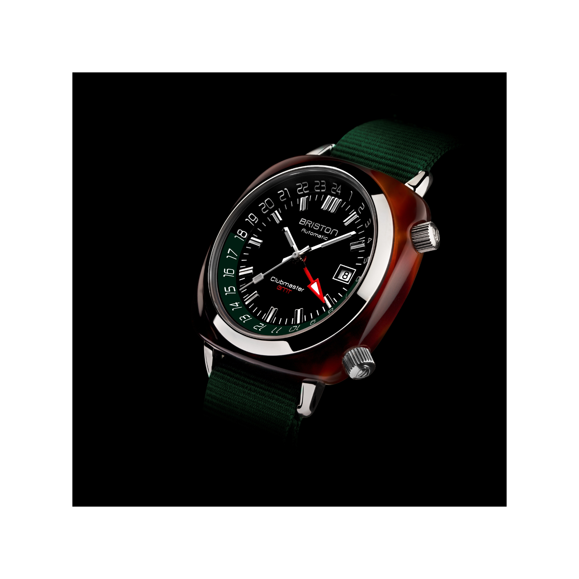 Montre HMS automatique Clubmaster Traveler GMT, 42 mm. Boitier en acier inoxydable et acétate écaille. Cadran noir. Heures, Minutes, Secondes, GMT et Date à guichet à 3 heures. Lunette bicolore tournante graduée 24 heures. Aiguilles en acier poli avec inserts Superluminova® naturel. Glace ultra résistante en saphir – 2,1 mm d’épaisseur. Bracelet exclusif Briston de type NATO, interchangeable, en nylon rouge. Calibre à mouvement automatique suisse SW330-1. Modèle en édition limitée à 500 exemplaires répartis sur toute la collection.