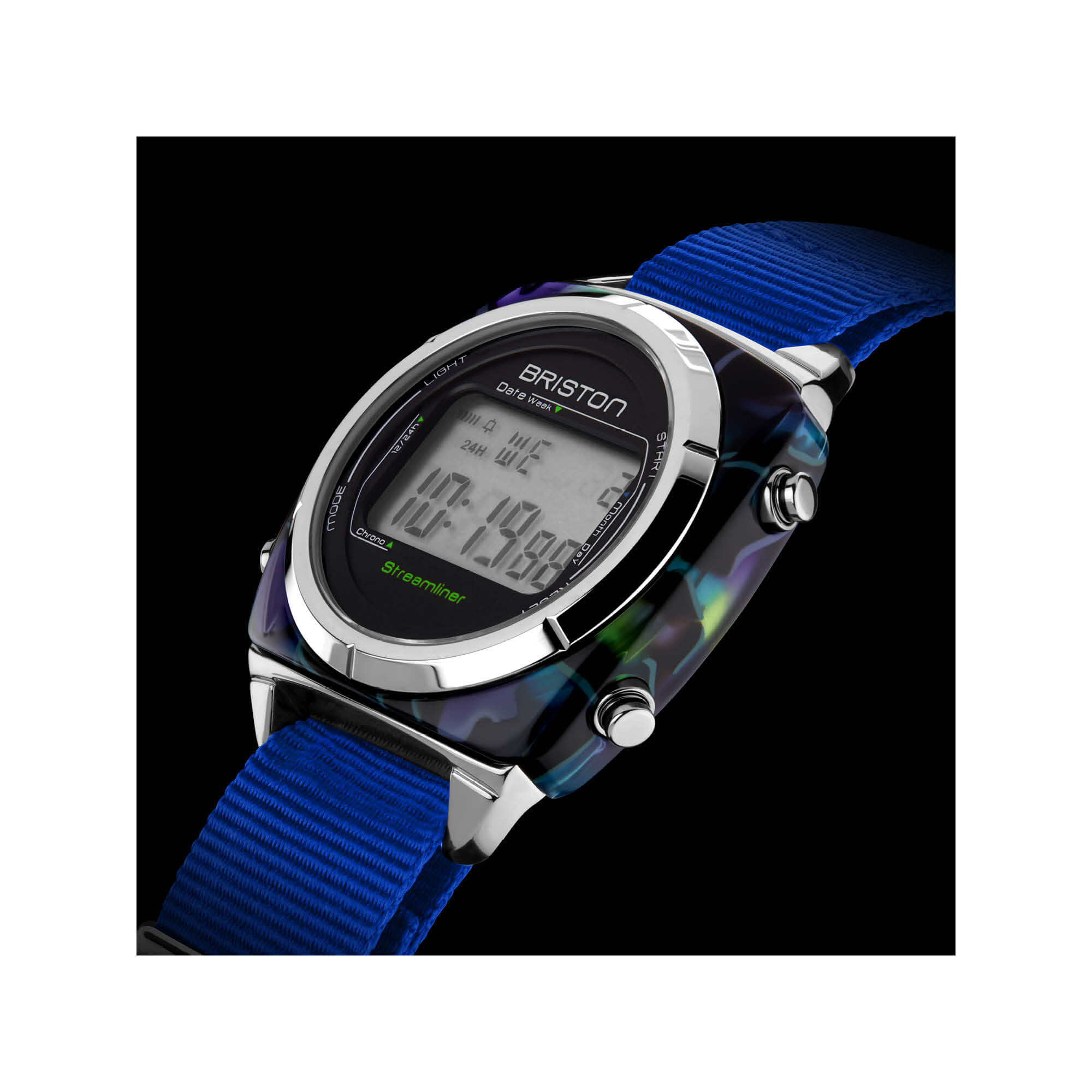 - Partie centrale noir semi brillante ou en acier avec traits & mentions Date, Week, Month, BRISTON, Alarm, 100m/330FT, Sig, Spl, petits triangles et Streamliner en blanc noir ou en couleur