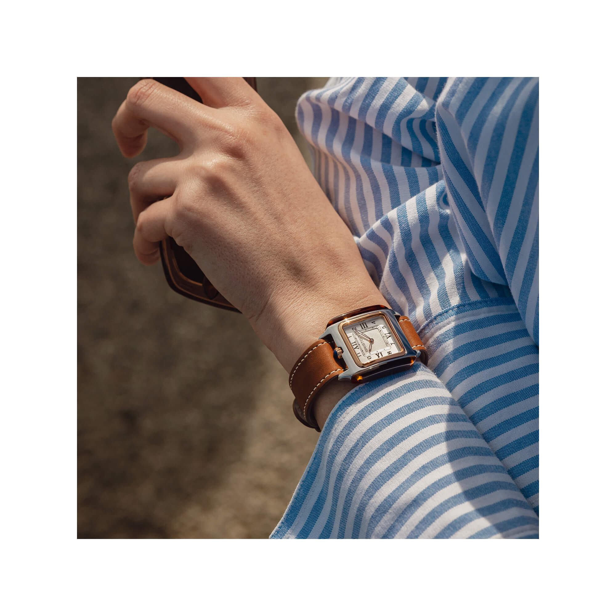 Montre HM Streamliner Kennedy, 30x30 mm. Boîtier carré en acier brossé avec flancs en acétate écaille. Couronne à 12h avec un cabochon en lapis-lazuli. Cadran blanc double couche, sous-cadran noir avec chiffres romains et arabes creusés et partie centrale avec minuterie chemin de fer et décoration motif guilloché. Heures et Minutes. Aiguilles style "Dauphine" en acier avec inserts SuperLuminova®. Glace ultra résistante K1 bombée. Bracelet NATO (18 mm), interchangeable, exclusif Briston : taupe avec boucle en acier. Calibre à quartz: Suisse Ronda Normtech 751. Étanchéité 50 m/ 5 ATM.