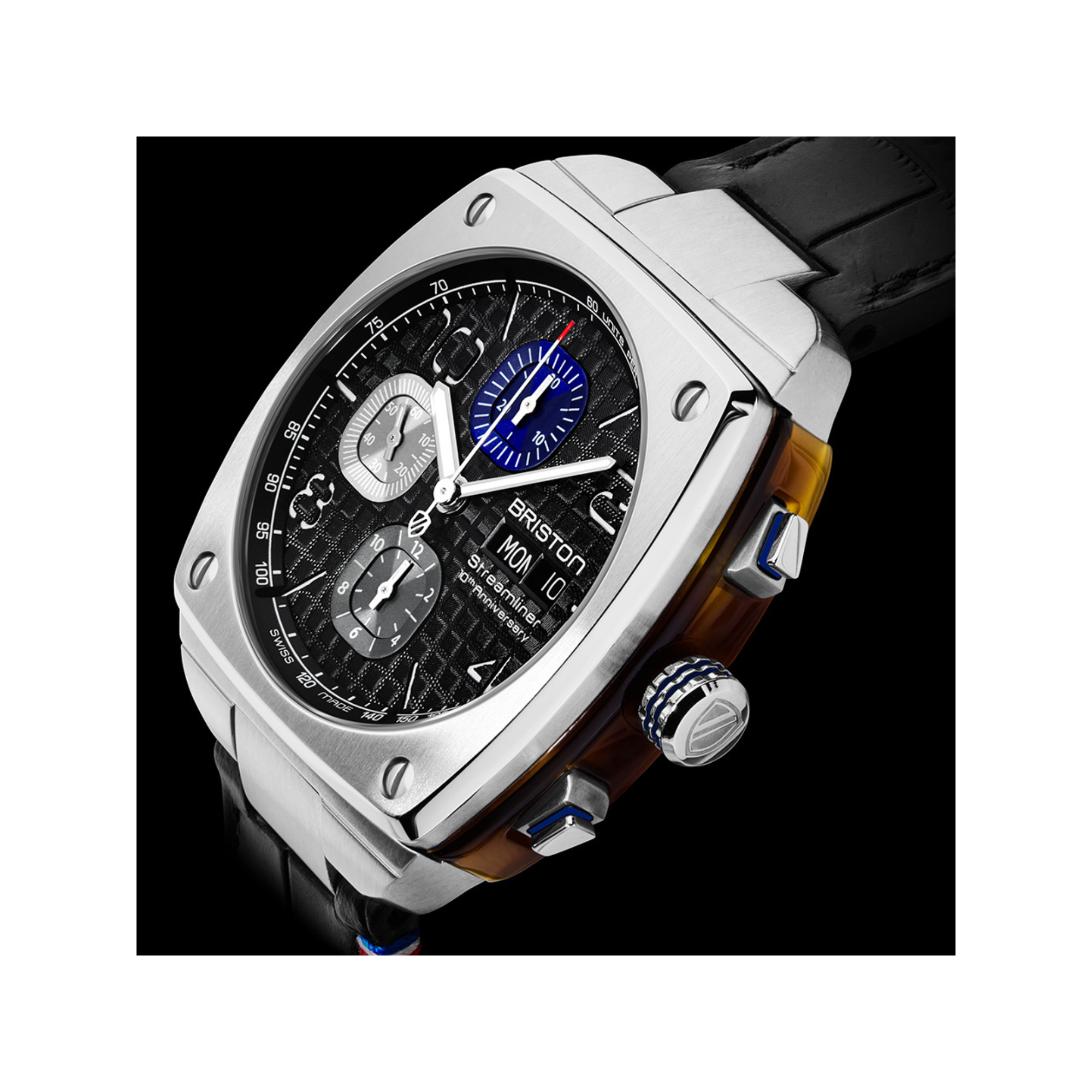 Montre chronographe Streamliner Urban - 10ème anniversaire, 43 mm. Boitier en acier et acétate écaille. Lunette supérieure en acier brossé vertical avec contours finition poli-miroir et 4 vis apparentes. Cadran supérieur noir avec motif gaufré. Heures et Minutes au centre, Petite Seconde à 9h, compteur 60 secondes au centre, compteur 30 minutes à 12h et compteur 12 heures à 6h. Date et Jour avec correction rapide à 3h. Aiguilles "bâtons" Heures et Minutes en acier brossé avec inserts luminescents. Aiguille centrale de chronographe laquée blanche avec pointe rouge. Glace ultra-résistante en saphir. Bracelet en cuir de veau motif "alligator" noir avec coutures du drapeau français. Mouvement Swiss Made chronographe SW500a. Masse oscillante avec gravure spéciale Briston 10th Anniversary.