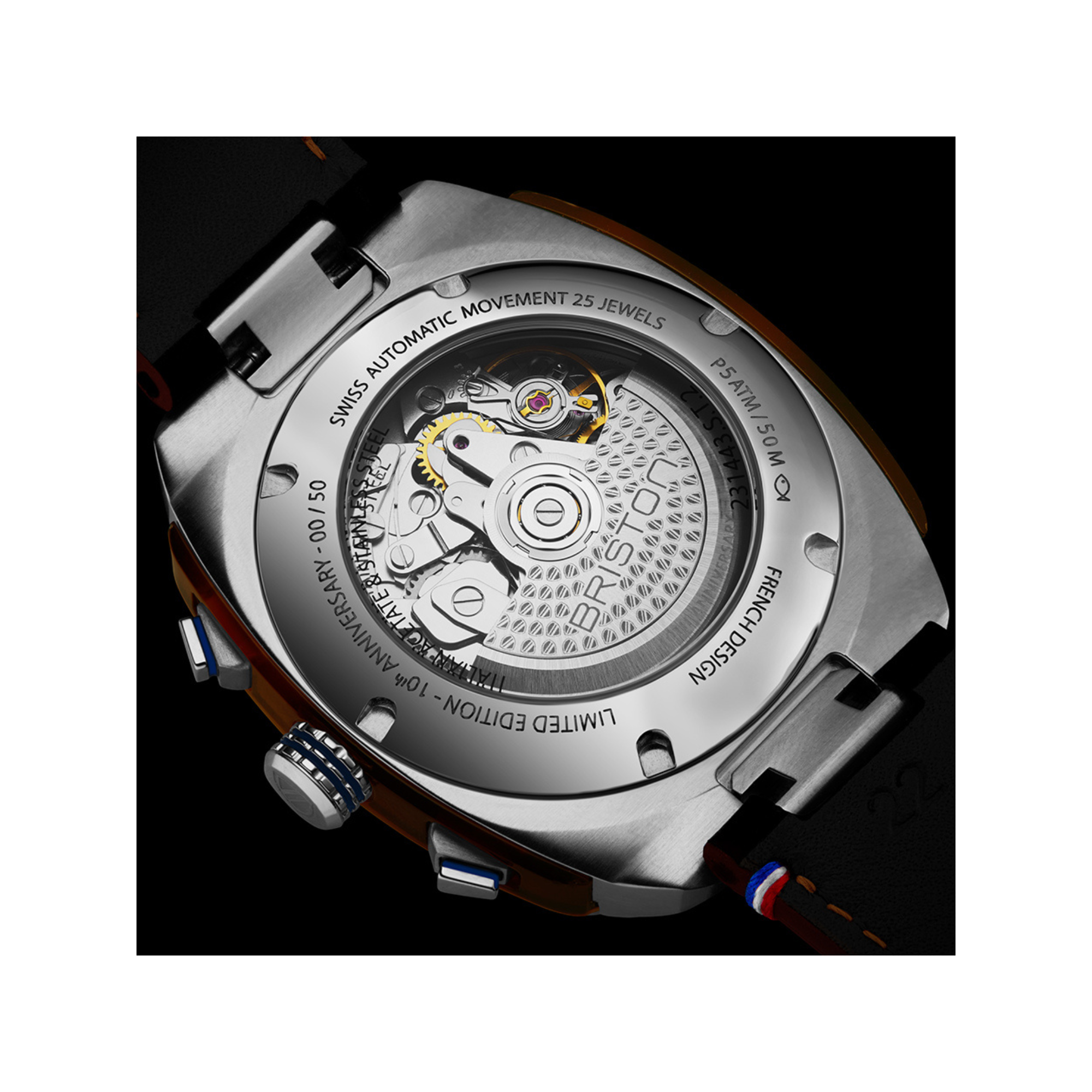 Cadran orné d’un embossage avec motif « gaufré », pureté des lignes, glace saphir, lunette supérieur en acier brossé et vis apparentes, corps de boîtier en acétate façon écaille de tortue avec finitions polie-satinée, fond transparent pour admirer le mouvement automatique doté d’une masse oscillante gravée de blasons Briston ainsi que de la mention « 10TH ANNIVERSARY ».